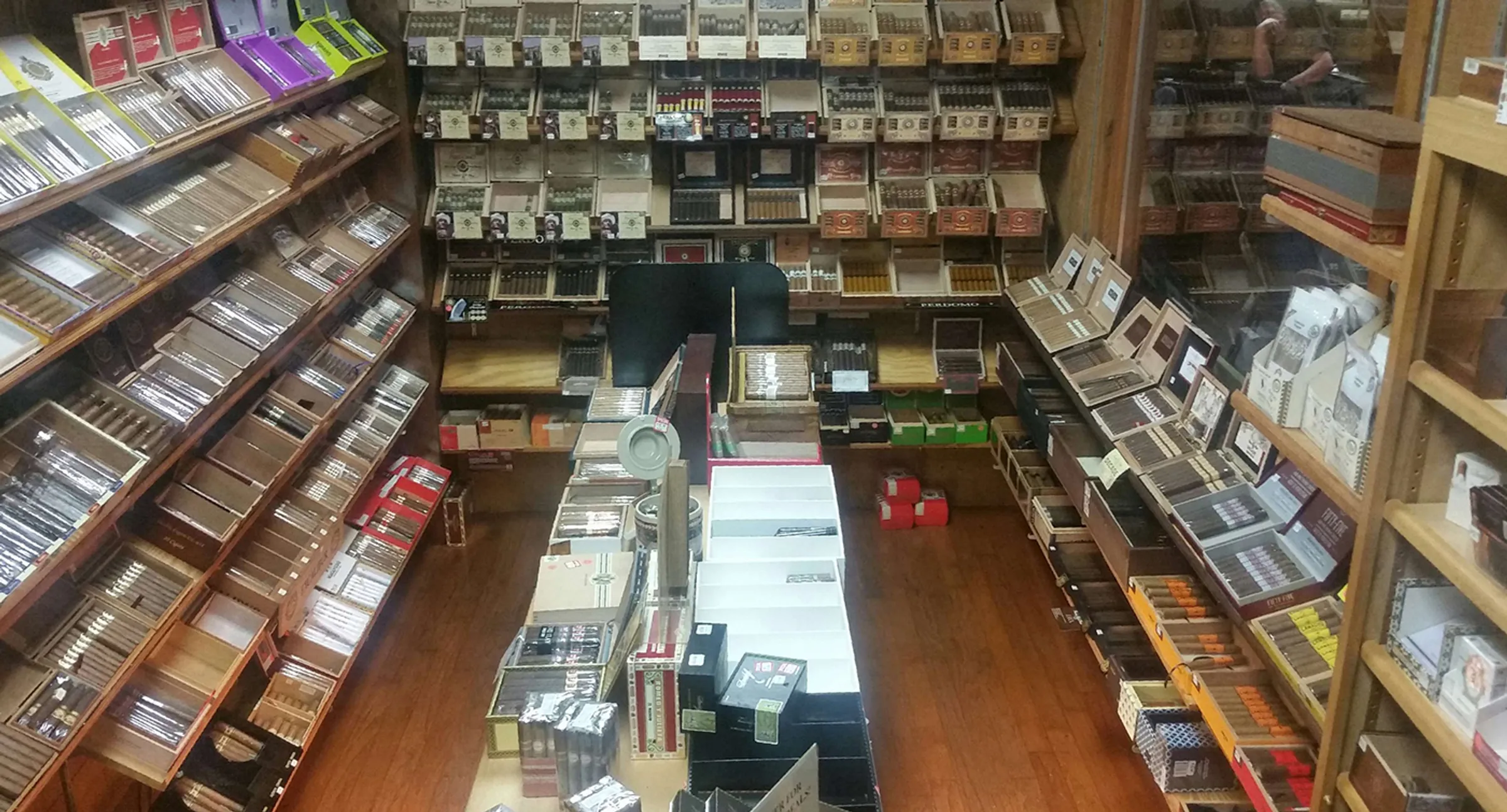Tight shot of the brand display wall — rows of cigar boxes with labels visible. Frames this section.